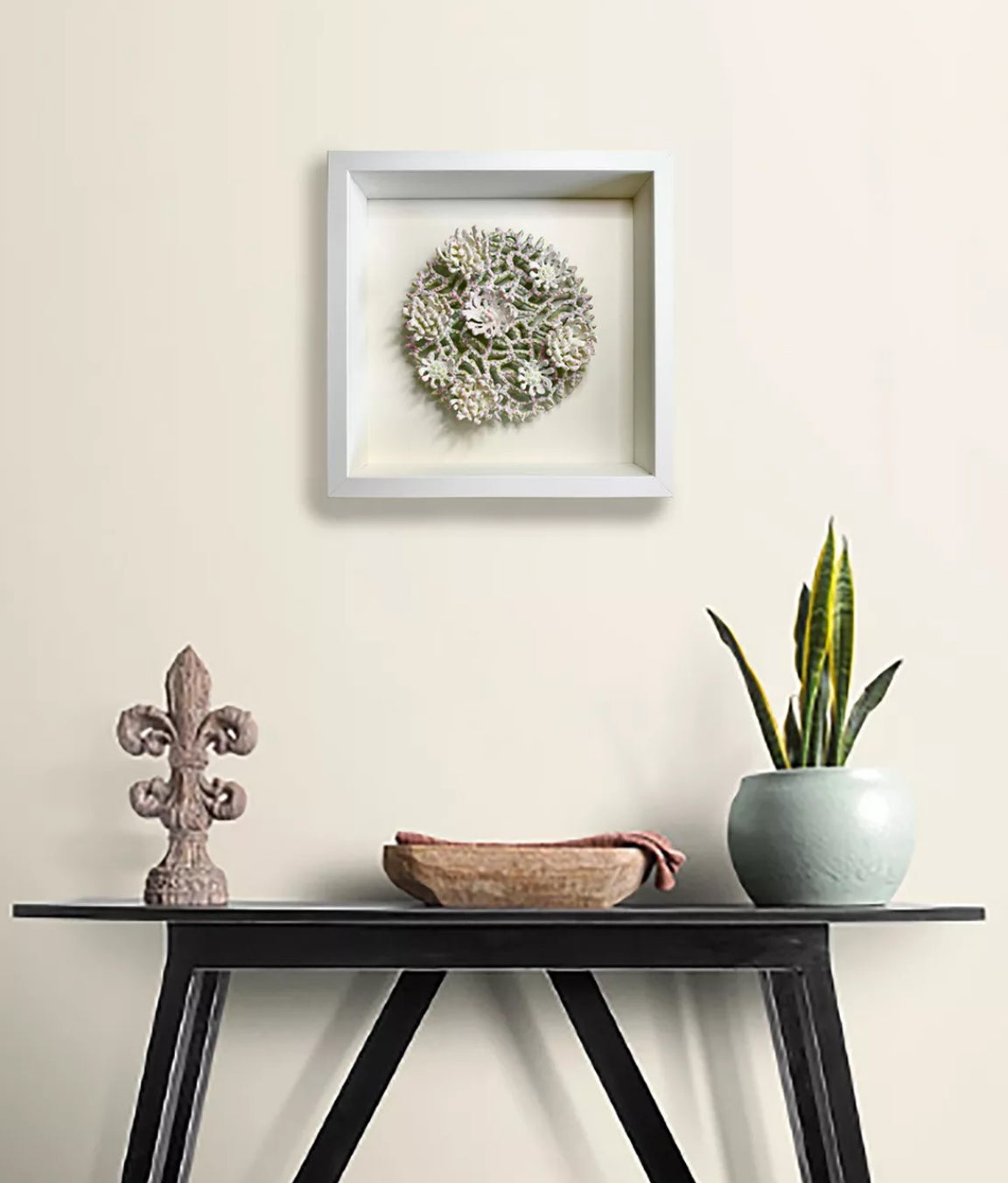 Elevated on foam board plinths, it casts enchanting shadows that shift and change with the light, inviting you to explore its depth from every angle. This unique feature not only enhances its visual appeal but also creates a dynamic interplay between light and form, making it a captivating focal point in any space.