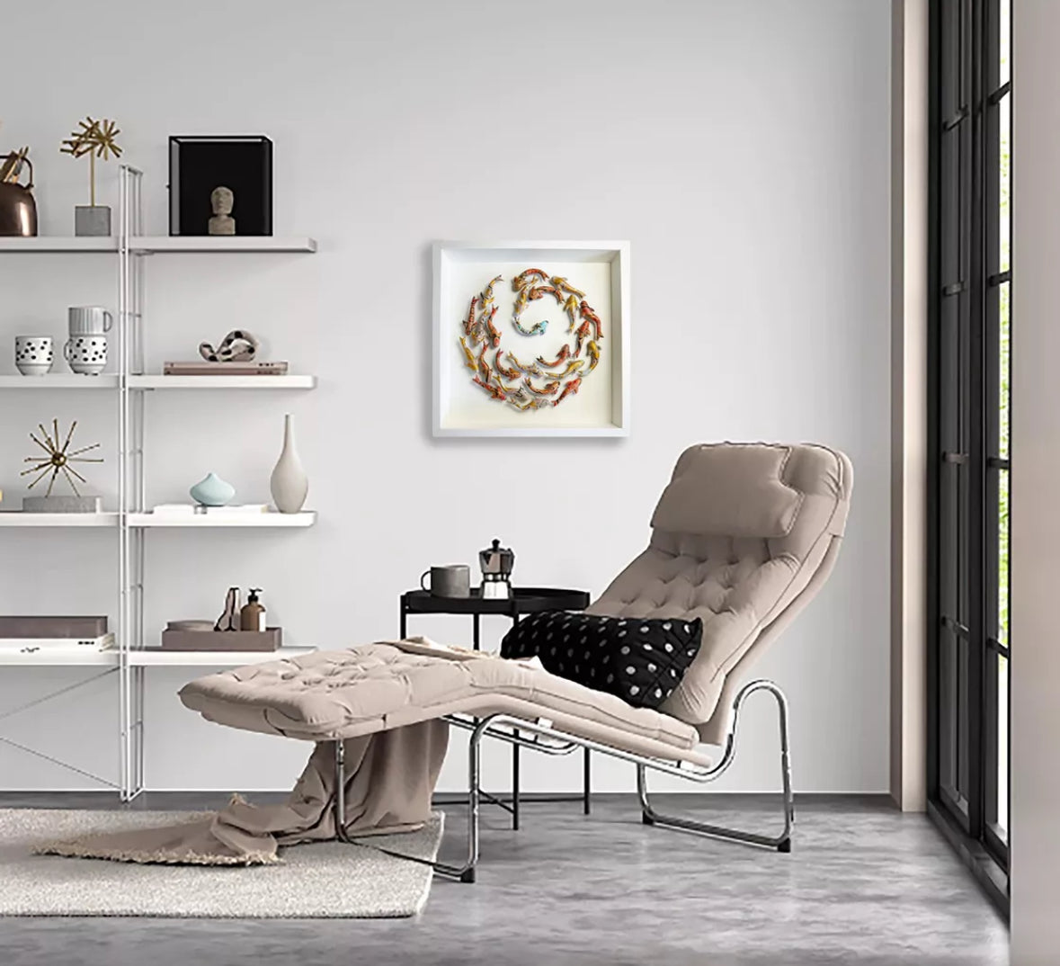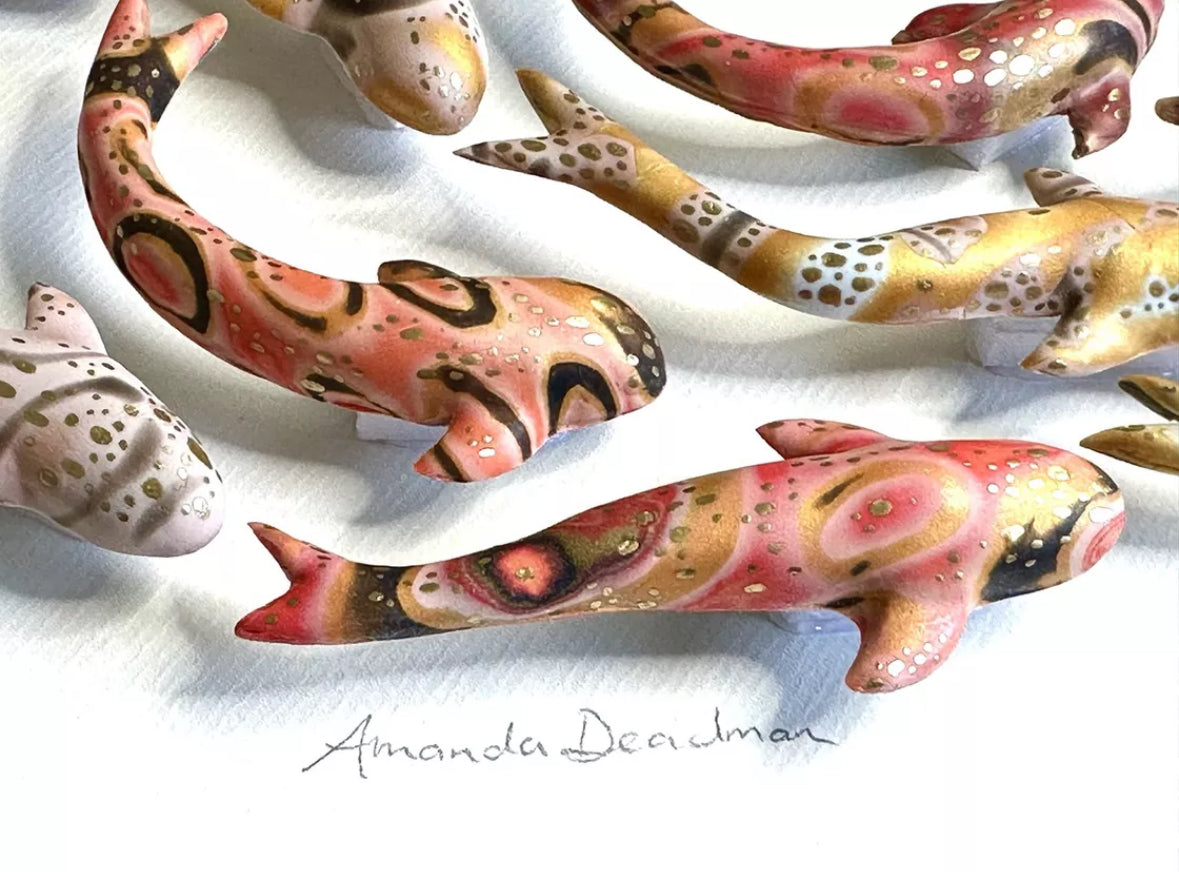 Each fish has additional decoration with speckles in silver and gold made with high gloss liquid chromium makers, and they are raised up on tiny foam board plinths which add the three-dimensional effect and cast different shadows depending on where the light comes from.