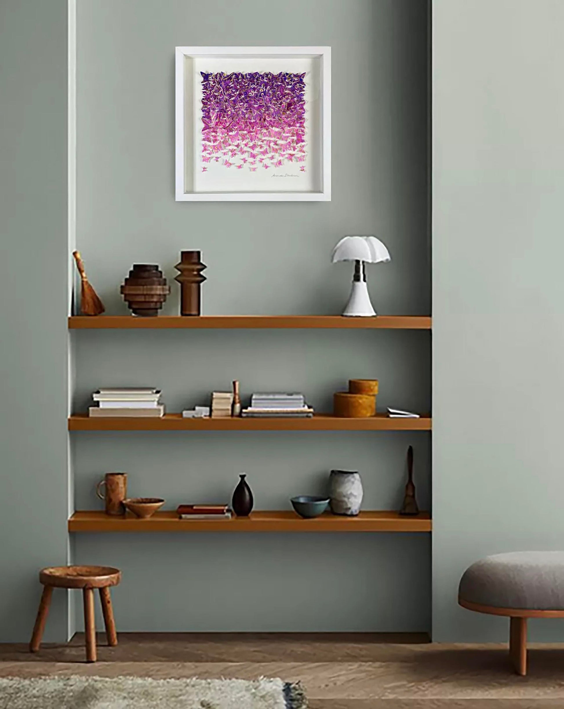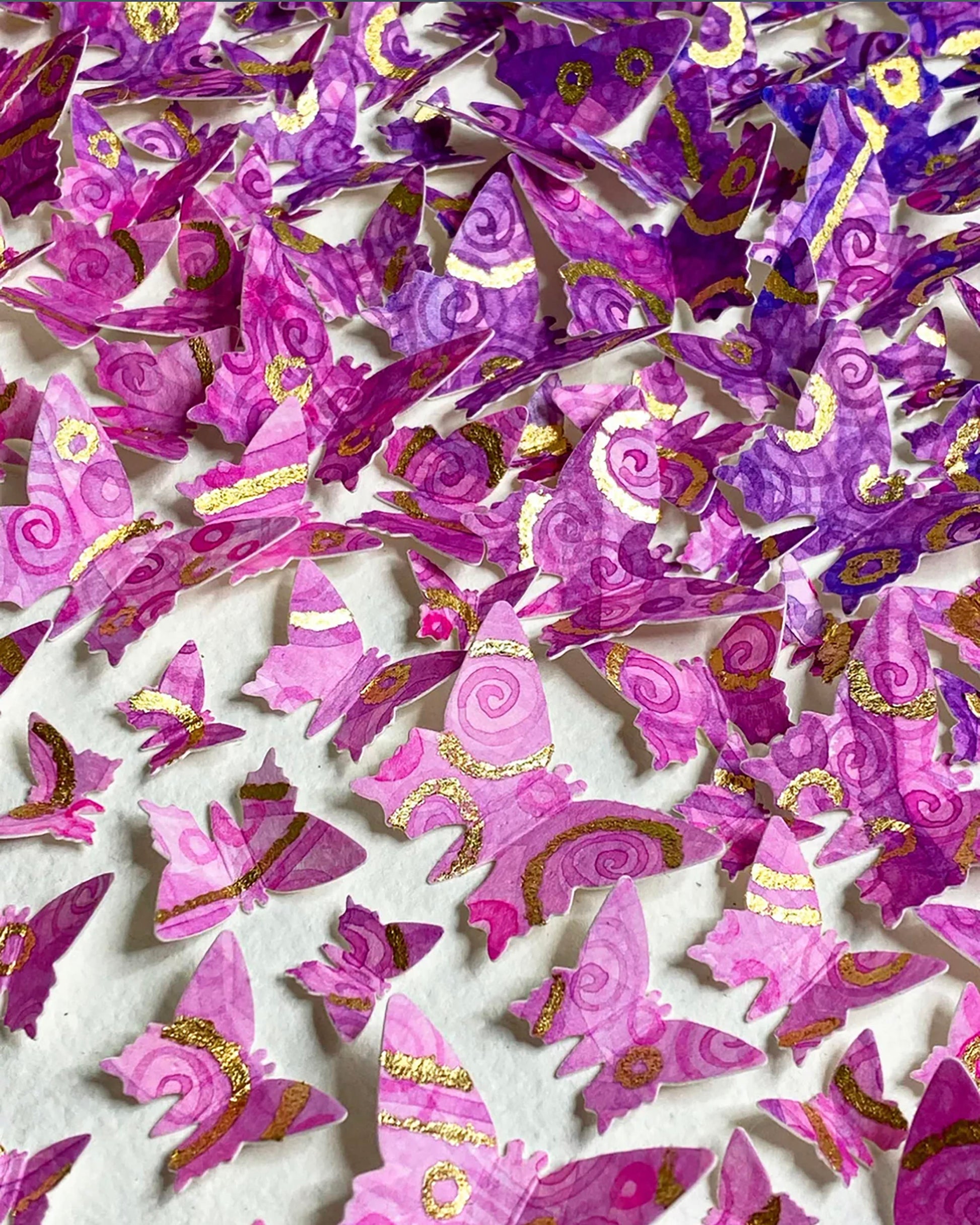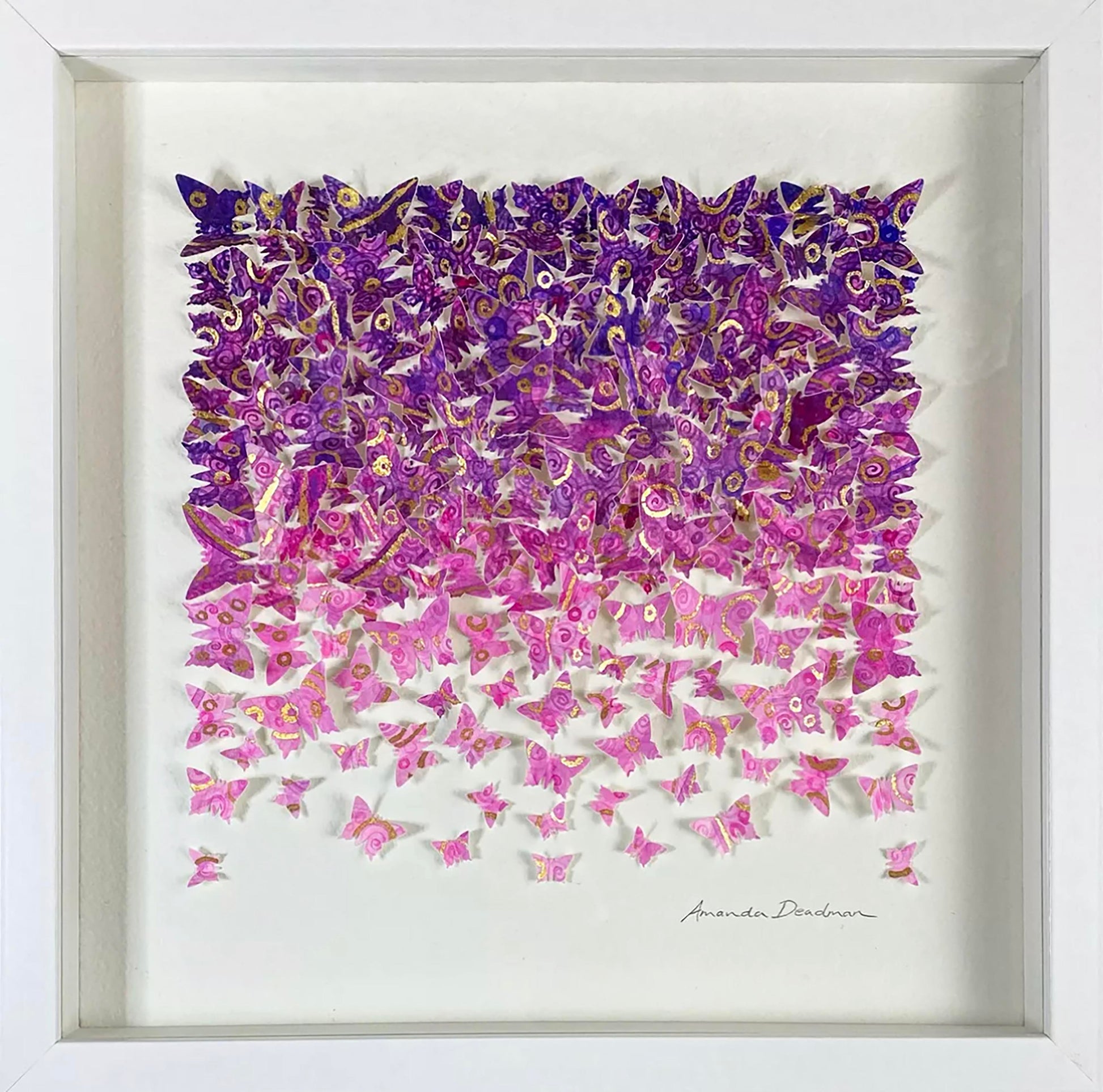 The result is a vibrant bluey purple to light pink modern relief design revealing individual butterflies on closer inspection. Different shadows are cast, and light reflected from the gold leaf on the up-turned wings depending on the direction of the light.