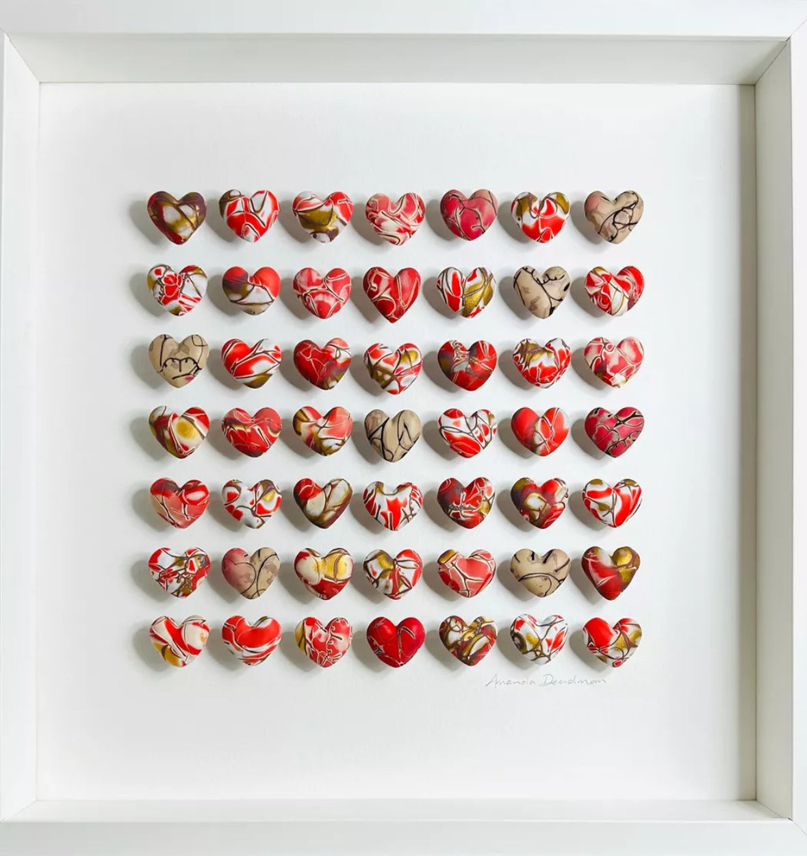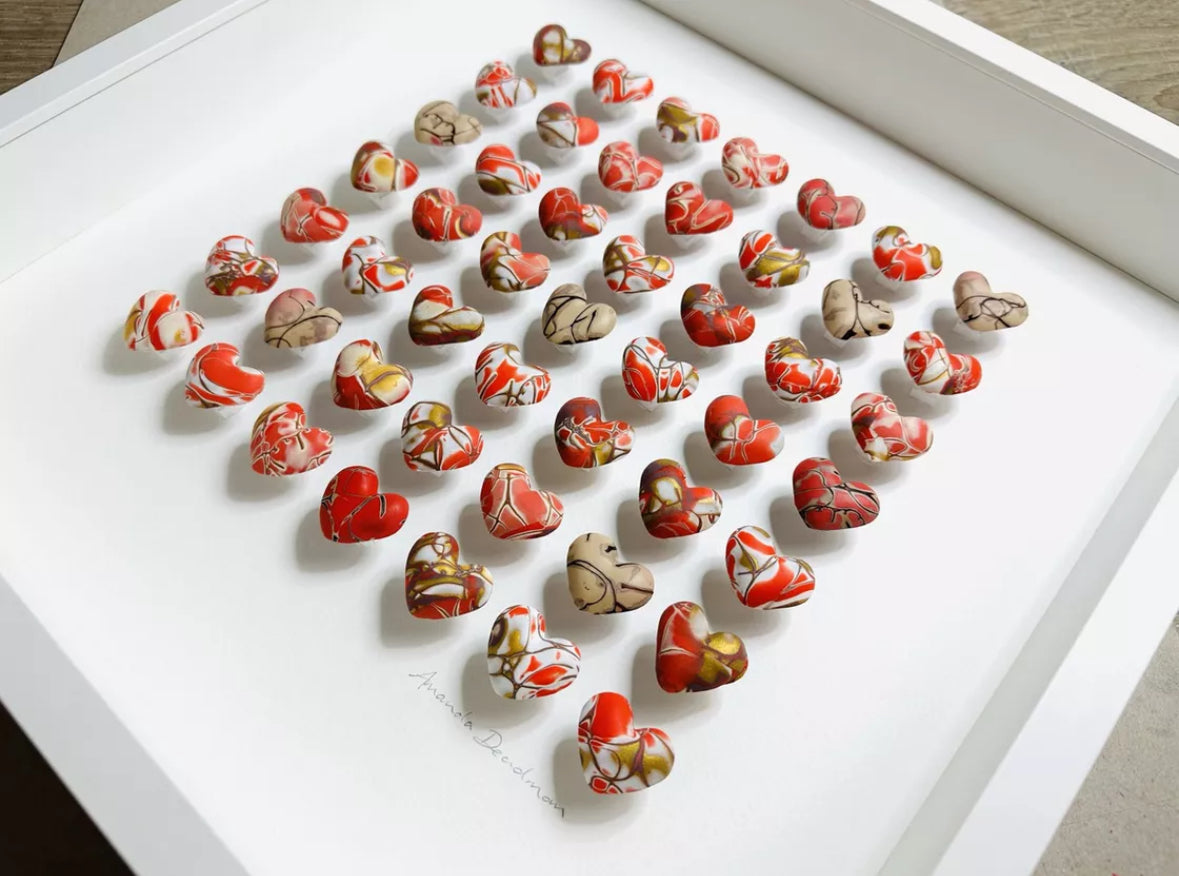 I created sheets of clay for these hearts using the Mokume Gane technique which is a decorative Japanese metal working technique, which originated from the 17th century when it was used to decorate samurai swords, and has been used with other materials such as polymer clay for many years now.