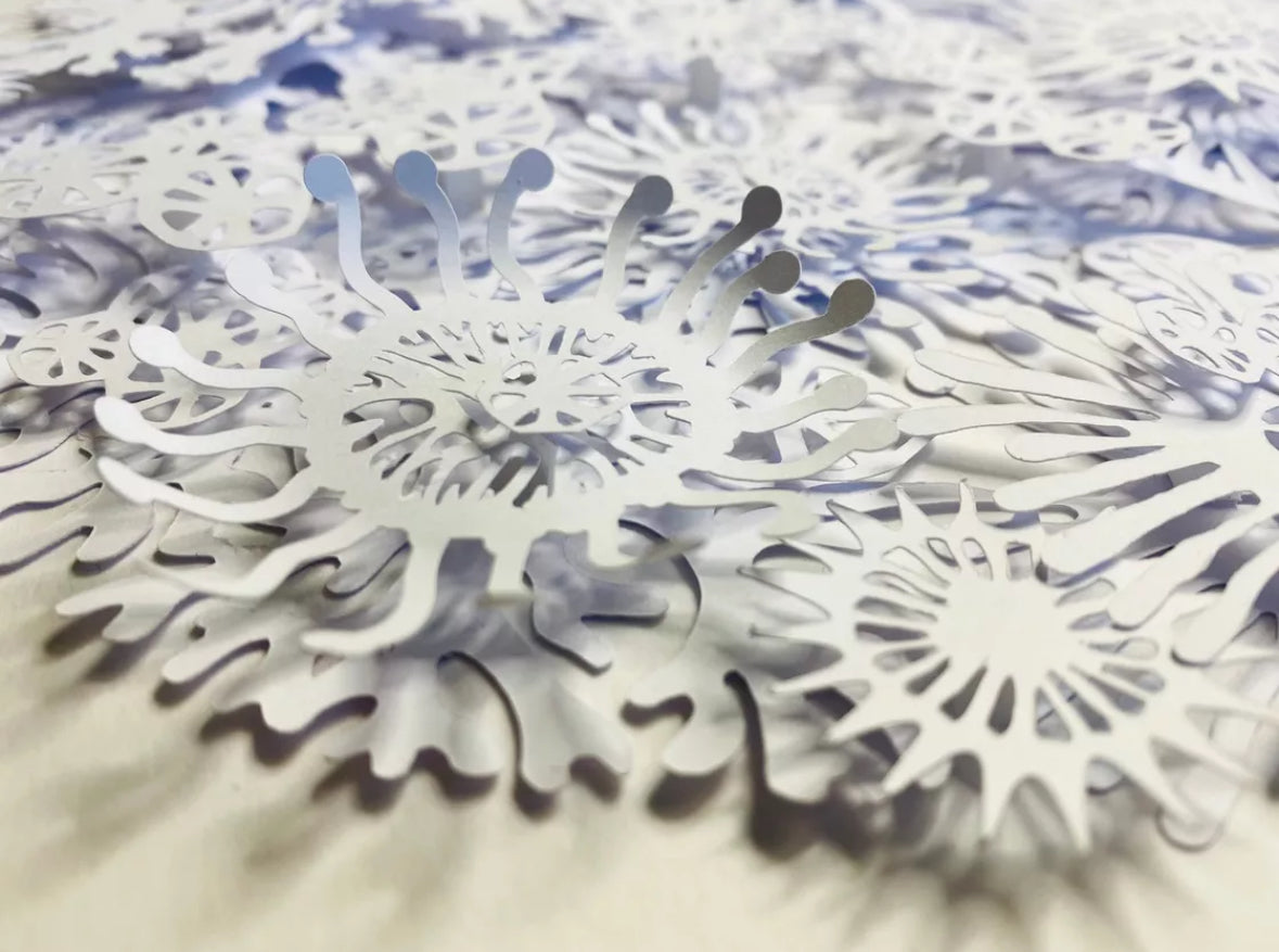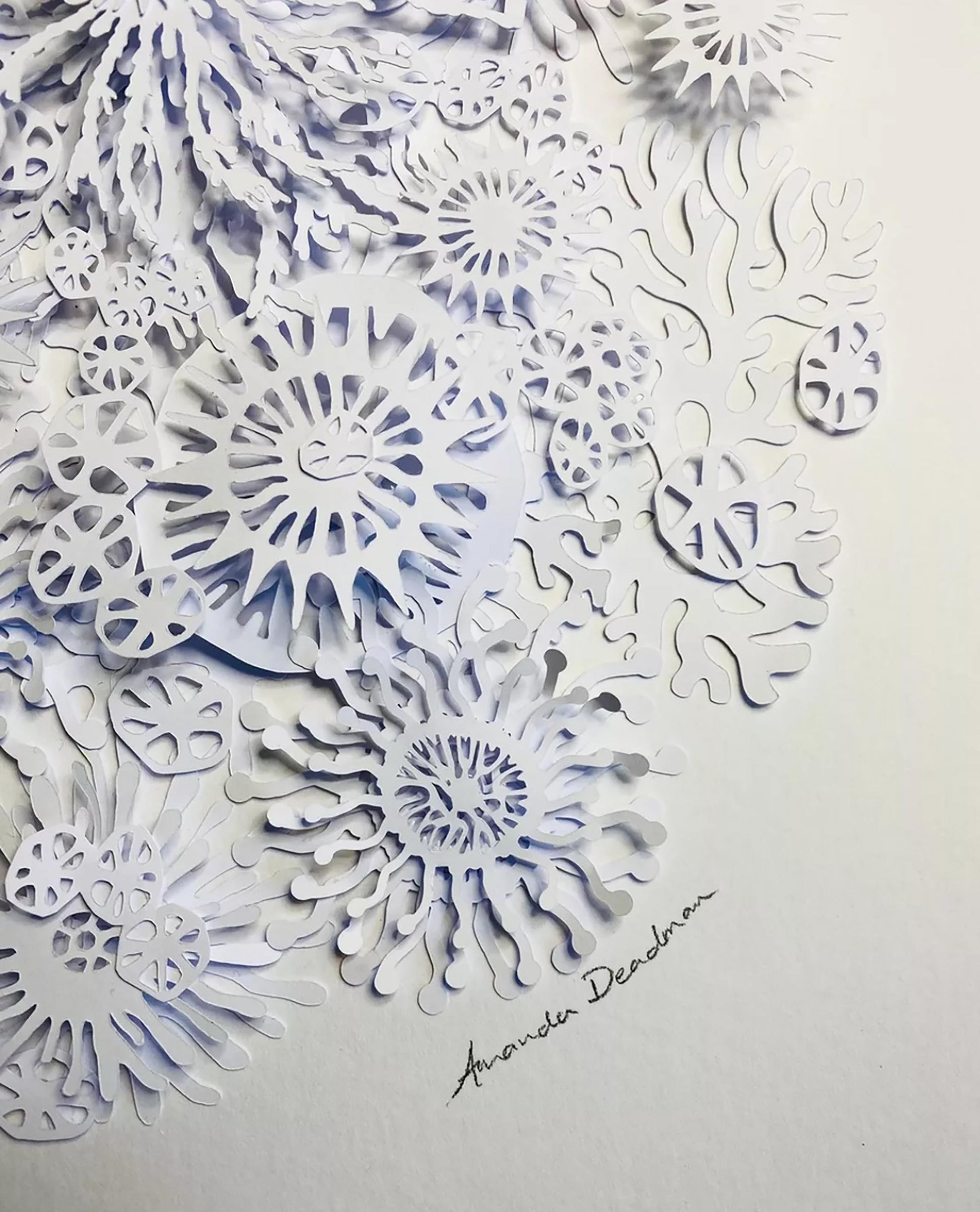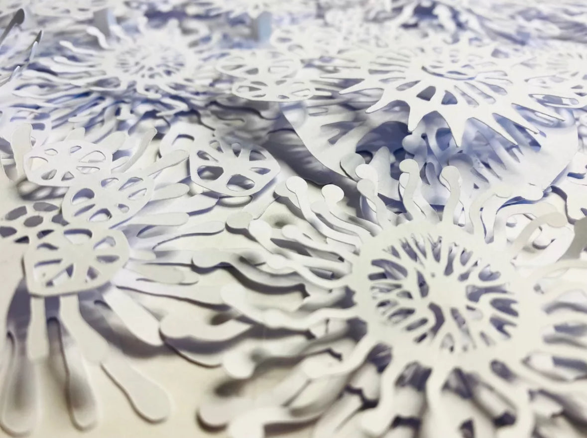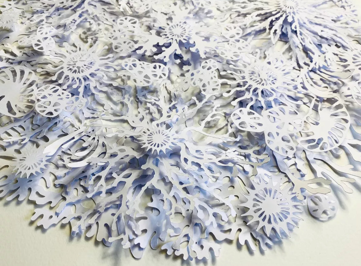 The result is a striking white dimensional relief design revealing individual coral, plant and plankton like shapes on closer inspection, and casting interesting shadows depending on the direction of the light.